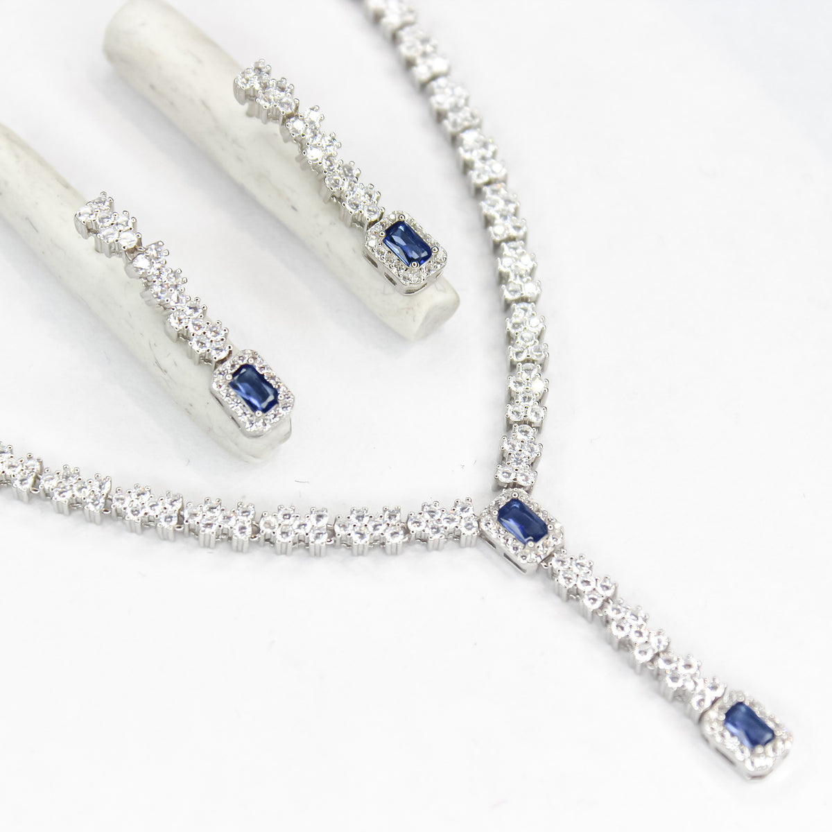 This striking set glows with regal blue stones, framed by shimmering white zircons—capturing timeless glamour, refined evenings, and the elegance of classic beauty. Every detail sparkles with grace and confidence.
