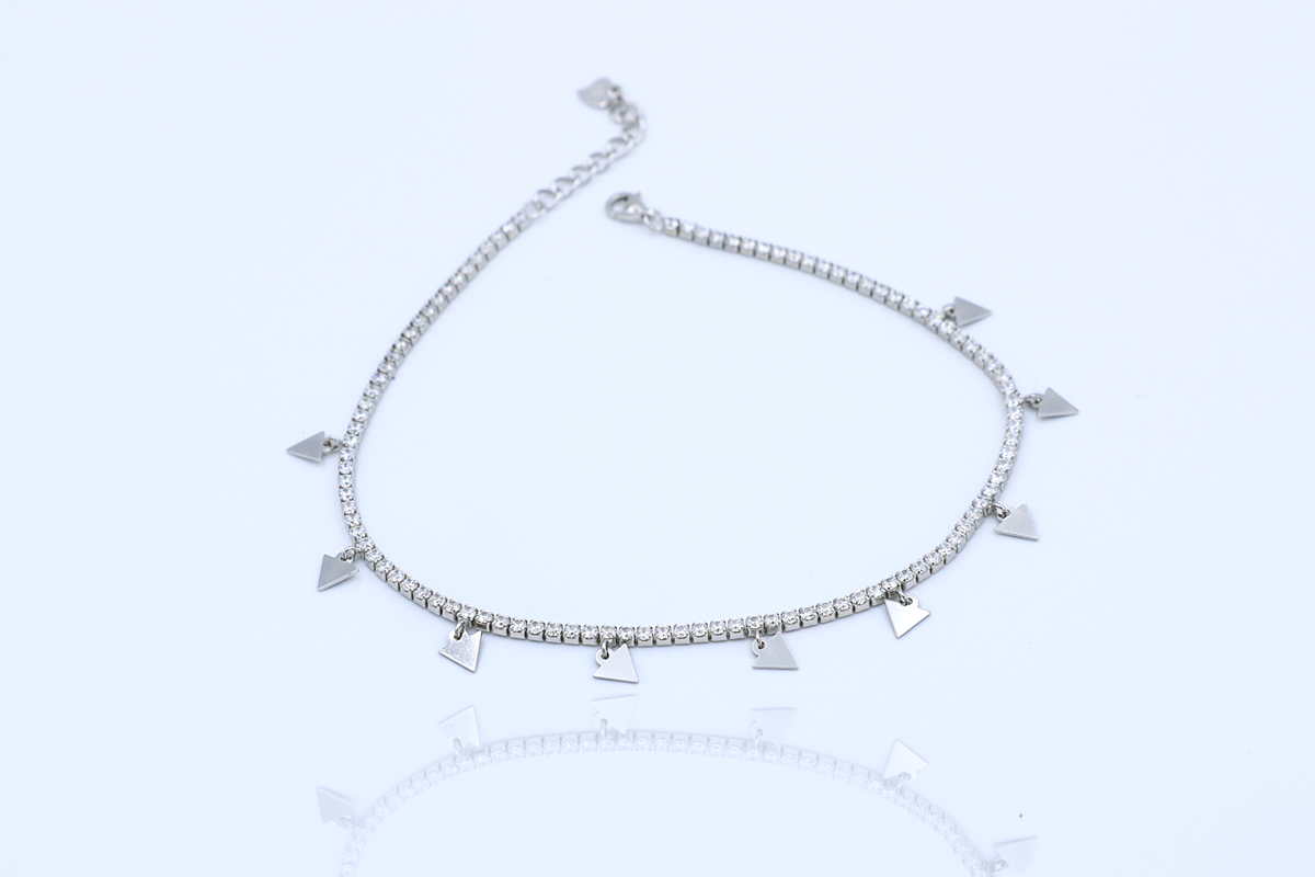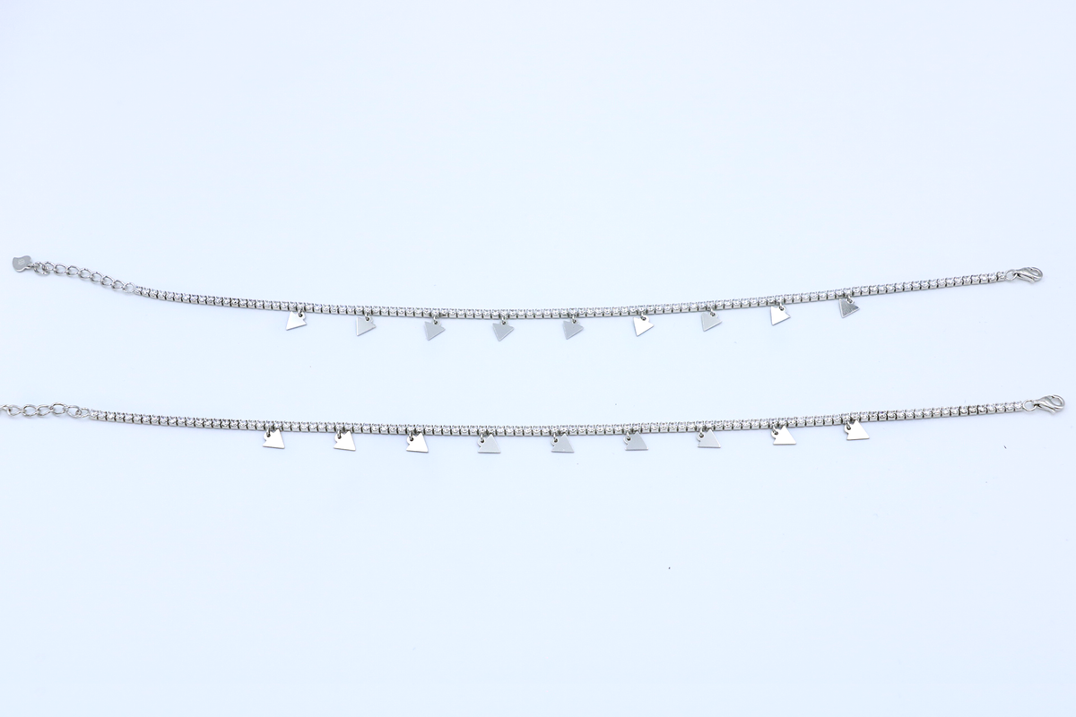 Inspiration: Ethereal silver anklet with cascading triangle charms, radiating playful motion and geometric grace. Each dangling triangle sways with quiet confidence, capturing the spirit of liberated elegance in every step.