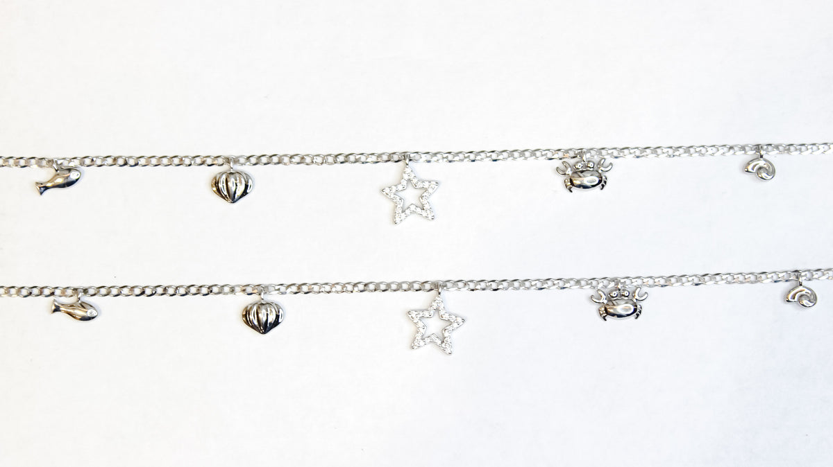 • Anklet with star-shaped zircon charm, crab, shell, fish, and heart-shaped motifs