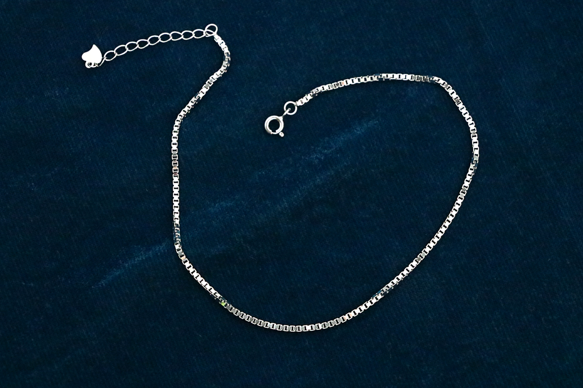 Inspiration: Crisp box-link silver anklet with a heart-tipped clasp, pulsing with refined minimalism and tender affection. Its structured links offer a sleek embrace, ideal for everyday allure and subtle sentiment.