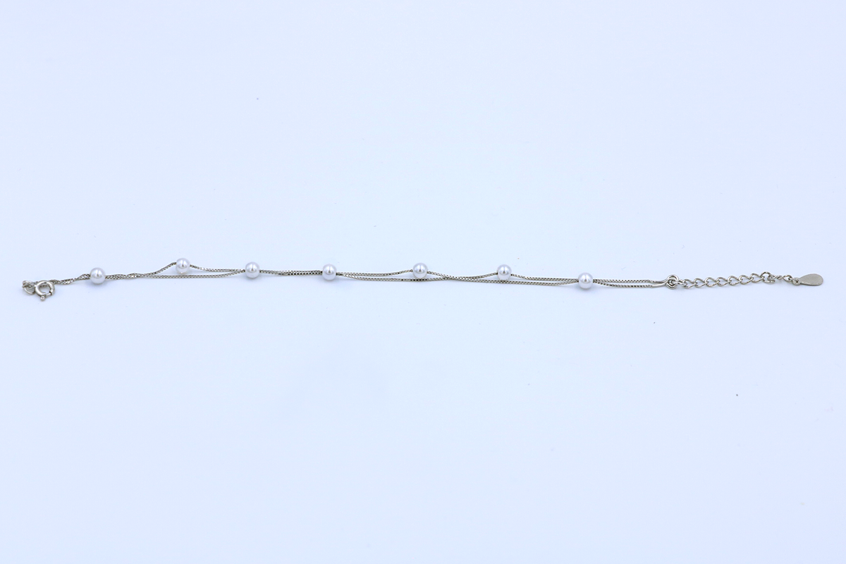 Delicate pearls float along dual silver strands, echoing the effortless grace of a gentle wave. This bracelet is designed for a woman who loves subtle shine and fluid elegance in every gesture.