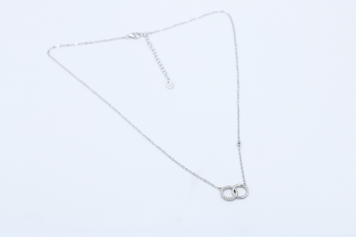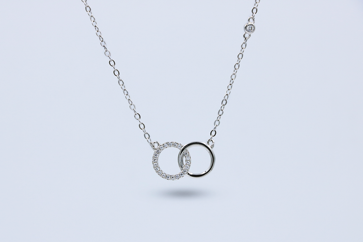 Inspiration: Interlocked silver rings, one pavé-set with zircon, form a pendant of unbreakable unity. Timeless and intimate, it whispers of bonds that loop forever without end.