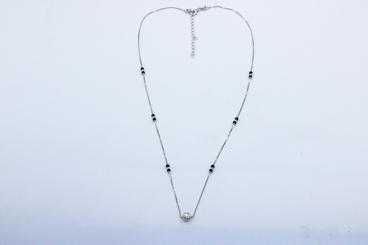 Inspiration: Sleek black beads anchor a minimalist chain with a lone zircon bead pendant, blending tradition with contemporary grace. Pure, protective, and poised for the modern soul.