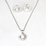 • Necklace and earrings with spiral-shaped pendants, centered with round white pearls, accented by white zircons