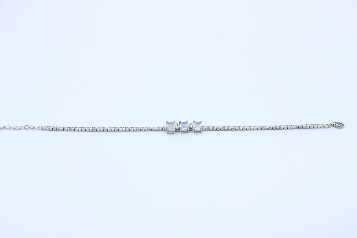 Inspiration: A delicate silver tennis chain centers three emerald-cut zircons that catch light with architectural precision. The trio's alignment evokes poised unity and crystalline clarity for the discerning wrist.