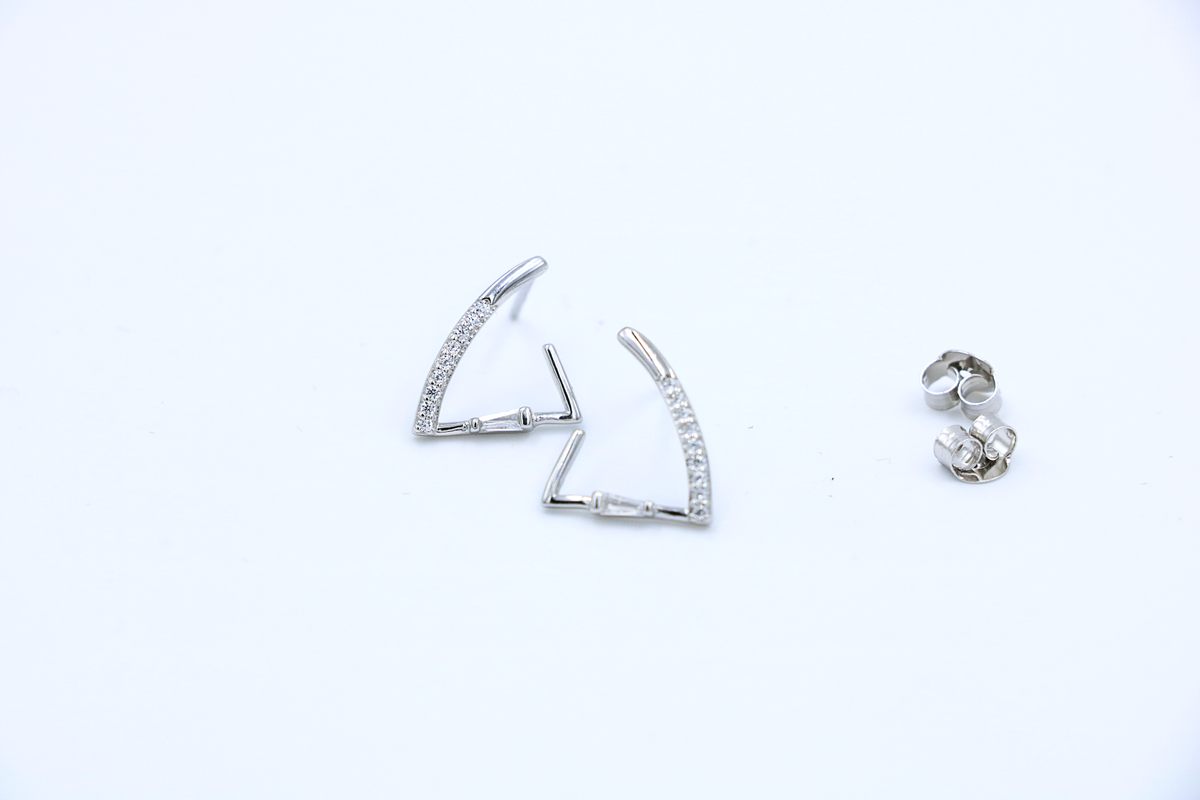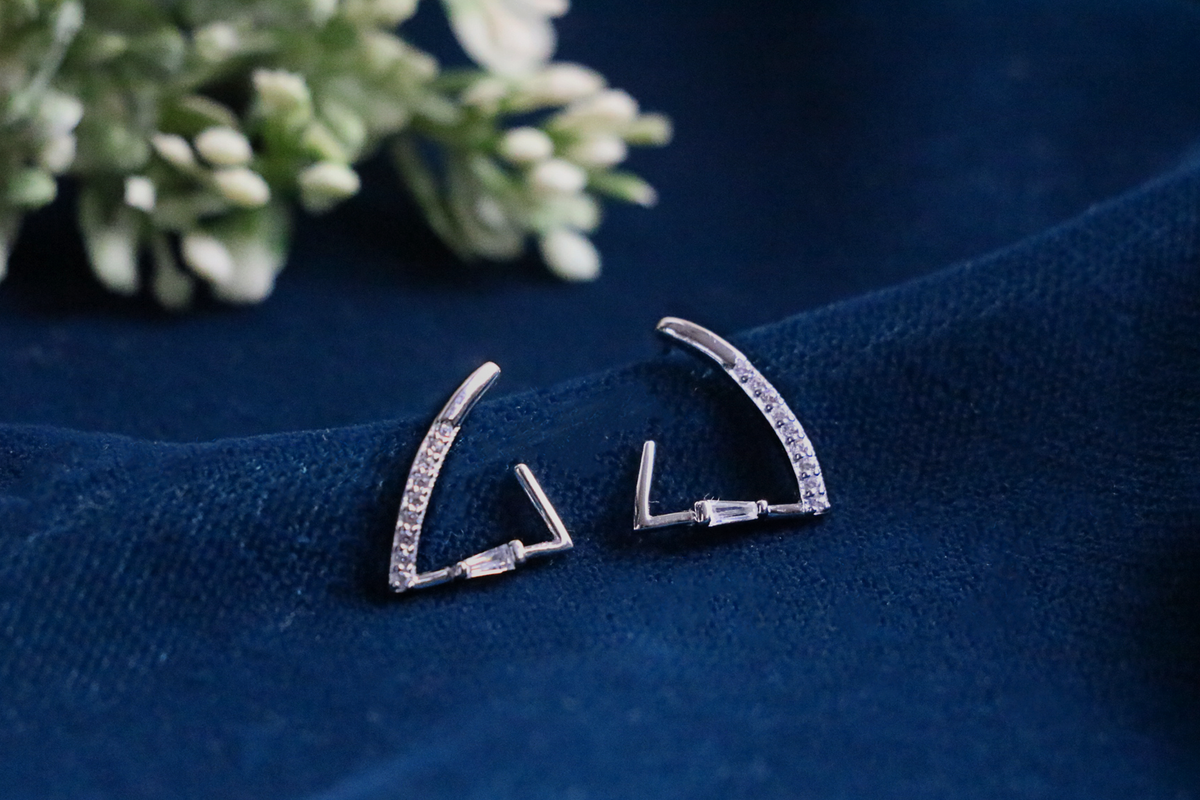 Inspiration: Angular silver triangles pavé-set with zircons form edgy drops, channeling bold geometry and dynamic energy. They symbolize fearless direction and crystalline intensity for striking presence.