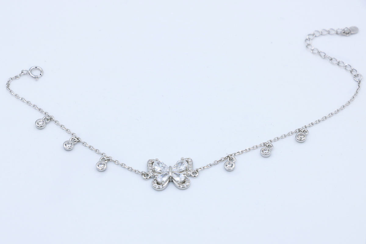 Inspiration: Ethereal butterfly wings unfurl in pavé zircon brilliance amid dangling crystal drops, whispering transformation and light-hearted freedom. Delicate chains evoke fleeting beauty captured in timeless silver grace.