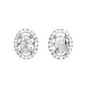 Oval-cut white zircon center surrounded by a halo of round-cut zircons