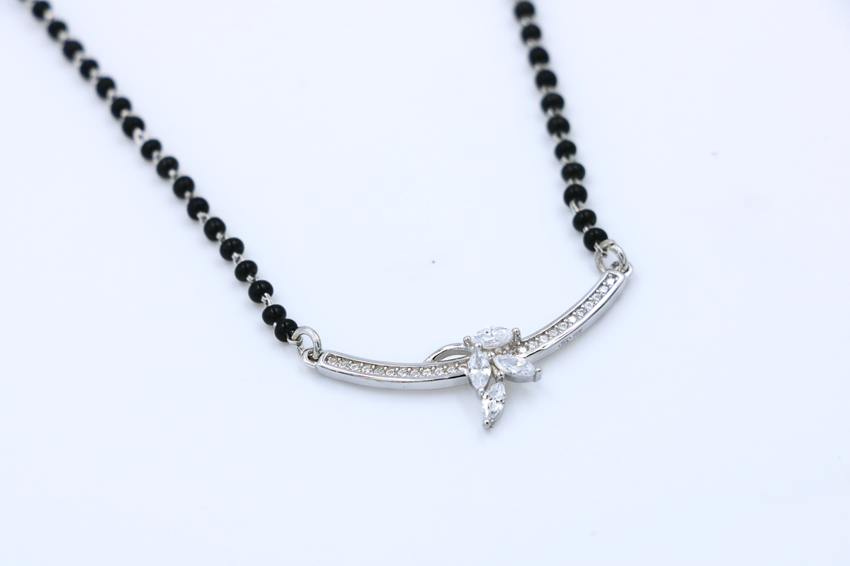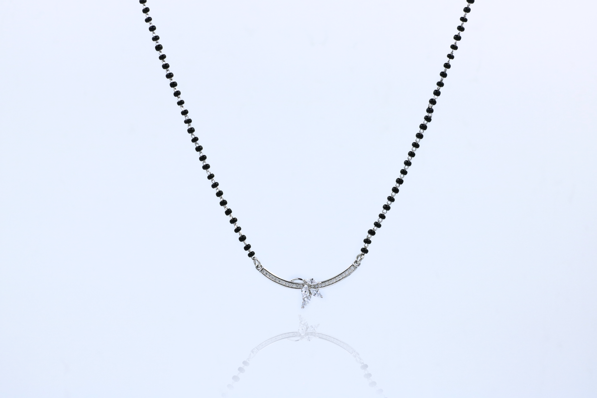 Inspiration: A pavé zircon bloom adorns a sleek silver arc on black bead chain, blending tradition with contemporary finesse. It symbolizes new beginnings and enduring marital grace.