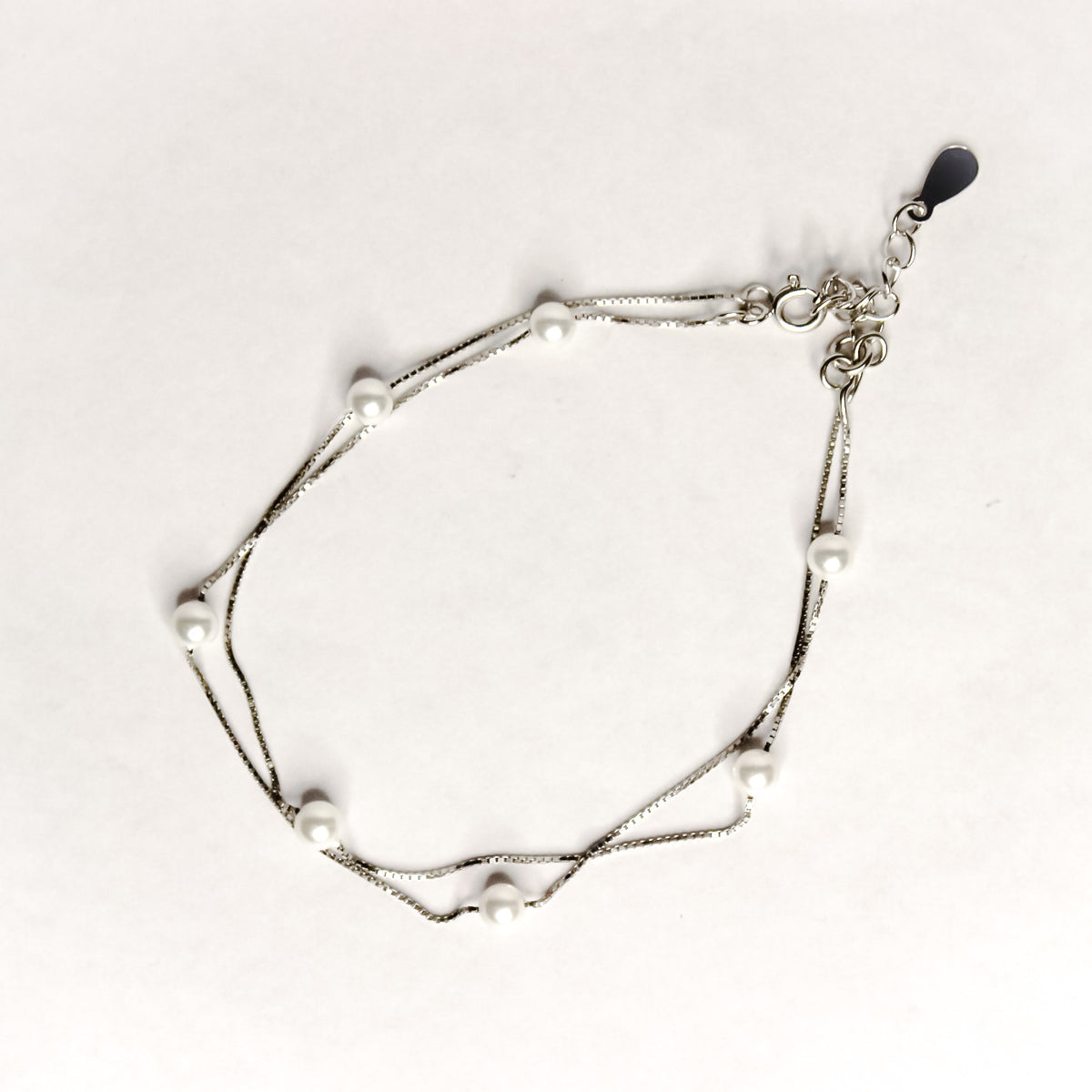 Delicate pearls float along dual silver strands, echoing the effortless grace of a gentle wave. This bracelet is designed for a woman who loves subtle shine and fluid elegance in every gesture.